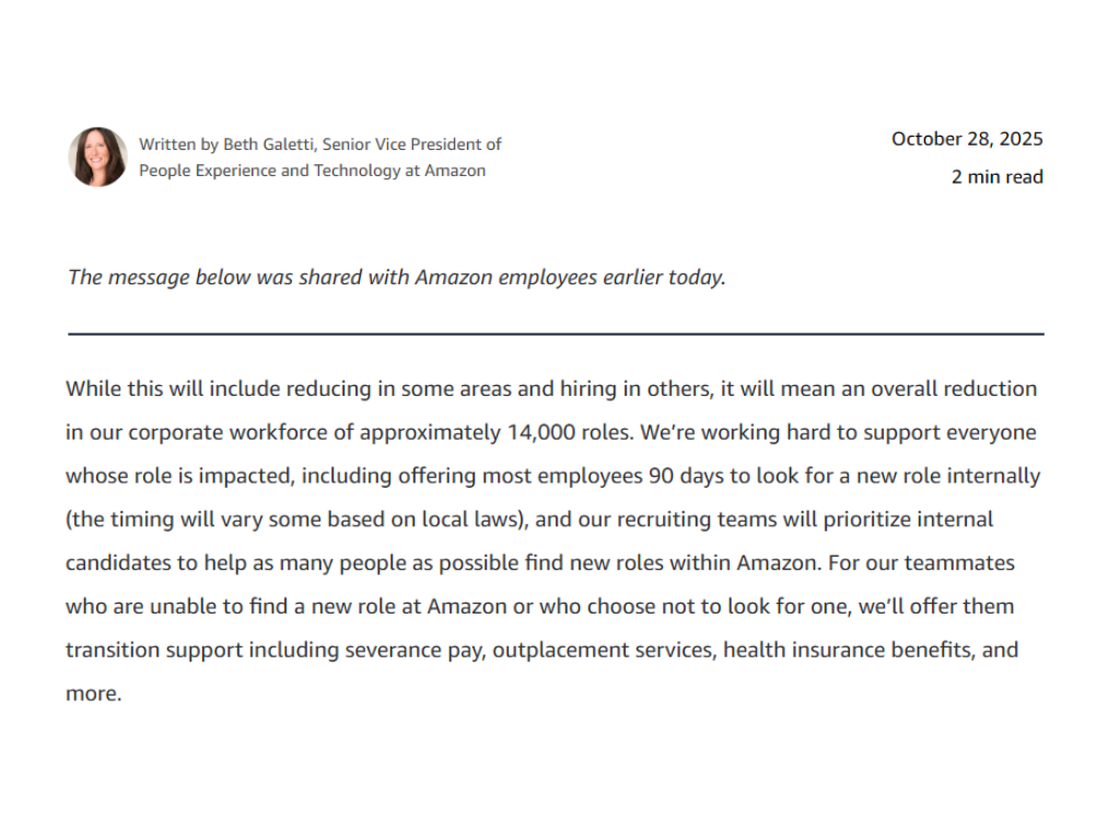 Amazon just joined the list of companies making massive cuts to their teams and announced the elimination of about 14,000 corporate roles at the end of October 2025. That number landed after days of rumors and leaks pointing to a possible adjustment of up to 30,000 positions, although the company stuck to the 14,000 figure as the confirmed round. The stated goal is to gain agility, simplify layers, and redirect resources toward strategic bets like artificial intelligence, without framing it as a plain cost-cutting move.